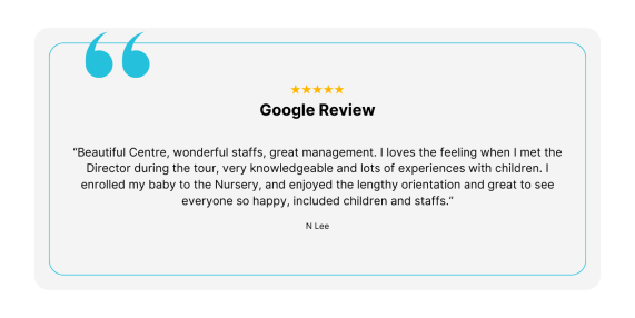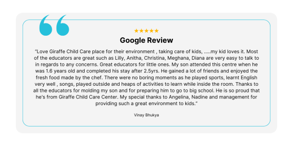As a mum myself, I understand how importance of attachment. At Giraffe, our priority is the child. We have a “no cry policy” whereby children are not left to cry during play, mealtimes nor during sleep times. Our staff will stay with your child, whether it be to pat them to sleep, encourage them to eat or simple stay by their side during play to ensure your child feels safe in their environment where they can explore and grow with confidence.