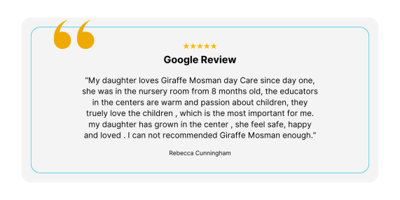 Your child’s day at Giraffe is designed to be a blend of learning and fun! They’ll enjoy a mix of structured activities, creative play, story time whether it be with books or puppets, music and outdoor time. Their transitions to rest times are relaxed and nutritious meals are offered every 2 hours. We make sure they’re engaged, learning, and having fun throughout the day.